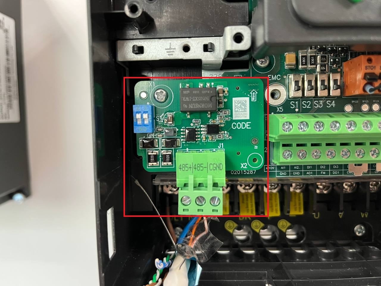 Осуществим управление частотным преобразователем Inovance MD520 при помощи модуля распределенной периферии CT-5321 Odot по RS-485. В частотный преобразователь необходимо установить интерфейсную плату Modbus RTU MD38TX1: