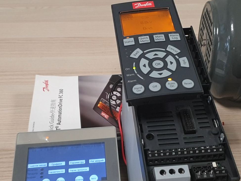 Подключили программируемую панель оператора Weintek MT8050iE по RS-485 интерфейсу к преобразователю частоты Danfoss FC-360 и реализовали полный функционал графической панели LCP